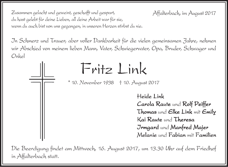 Hier finden Sie alle Traueranzeigen aus der Zeitung, die bisher für Fritz Link erschienen sind. Weitere Traueranzeigen, die in der Zeitung erscheinen, werden hier ebenfalls aufgelistet
