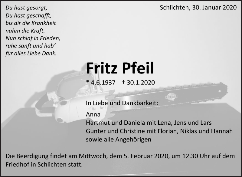 Hier finden Sie alle Traueranzeigen aus der Zeitung, die bisher für Fritz Pfeil erschienen sind. Weitere Traueranzeigen, die in der Zeitung erscheinen, werden hier ebenfalls aufgelistet