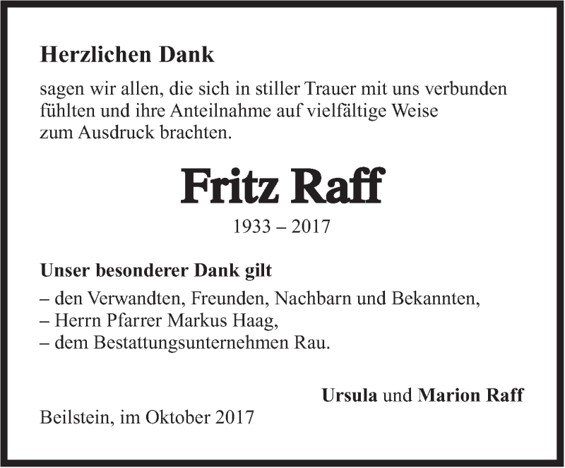 Hier finden Sie alle Traueranzeigen aus der Zeitung, die bisher für Fritz Raff erschienen sind. Weitere Traueranzeigen, die in der Zeitung erscheinen, werden hier ebenfalls aufgelistet