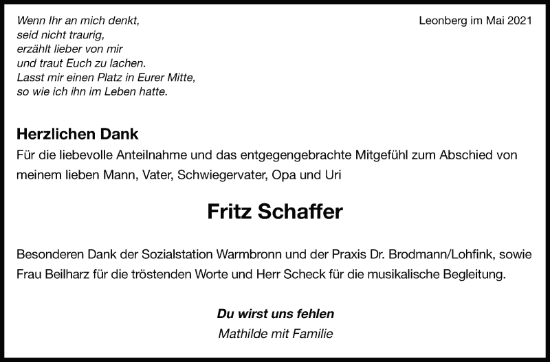 Hier finden Sie alle Traueranzeigen aus der Zeitung, die bisher für Fritz Schaffer erschienen sind. Weitere Traueranzeigen, die in der Zeitung erscheinen, werden hier ebenfalls aufgelistet
