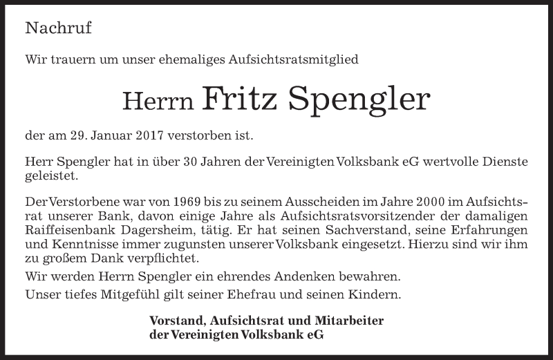 Hier finden Sie alle Traueranzeigen aus der Zeitung, die bisher für Fritz Spengler erschienen sind. Weitere Traueranzeigen, die in der Zeitung erscheinen, werden hier ebenfalls aufgelistet