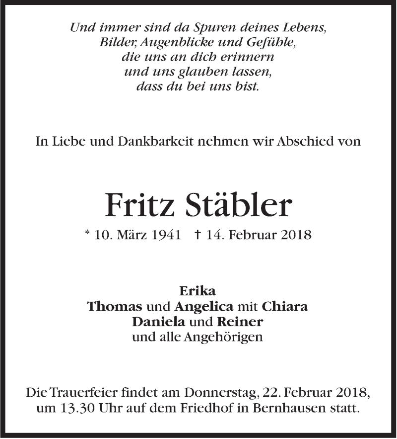 Hier finden Sie alle Traueranzeigen aus der Zeitung, die bisher für Fritz Stäbler erschienen sind. Weitere Traueranzeigen, die in der Zeitung erscheinen, werden hier ebenfalls aufgelistet