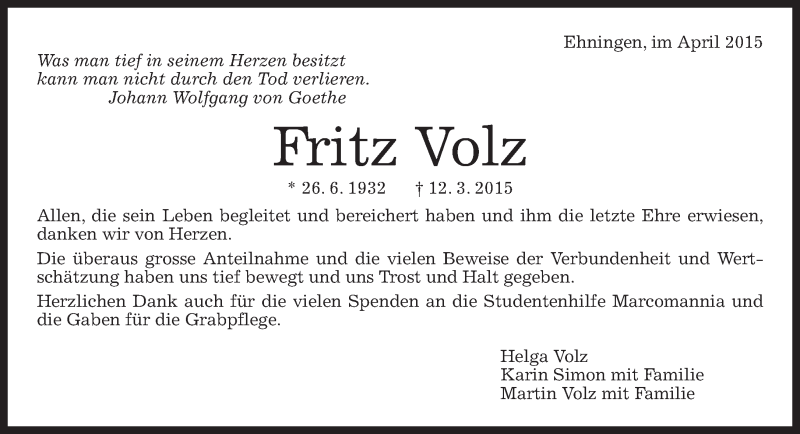 Hier finden Sie alle Traueranzeigen aus der Zeitung, die bisher für Fritz Volz erschienen sind. Weitere Traueranzeigen, die in der Zeitung erscheinen, werden hier ebenfalls aufgelistet