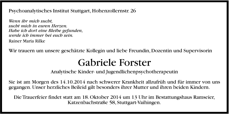 Hier finden Sie alle Traueranzeigen aus der Zeitung, die bisher für Gabriele Forster erschienen sind. Weitere Traueranzeigen, die in der Zeitung erscheinen, werden hier ebenfalls aufgelistet
