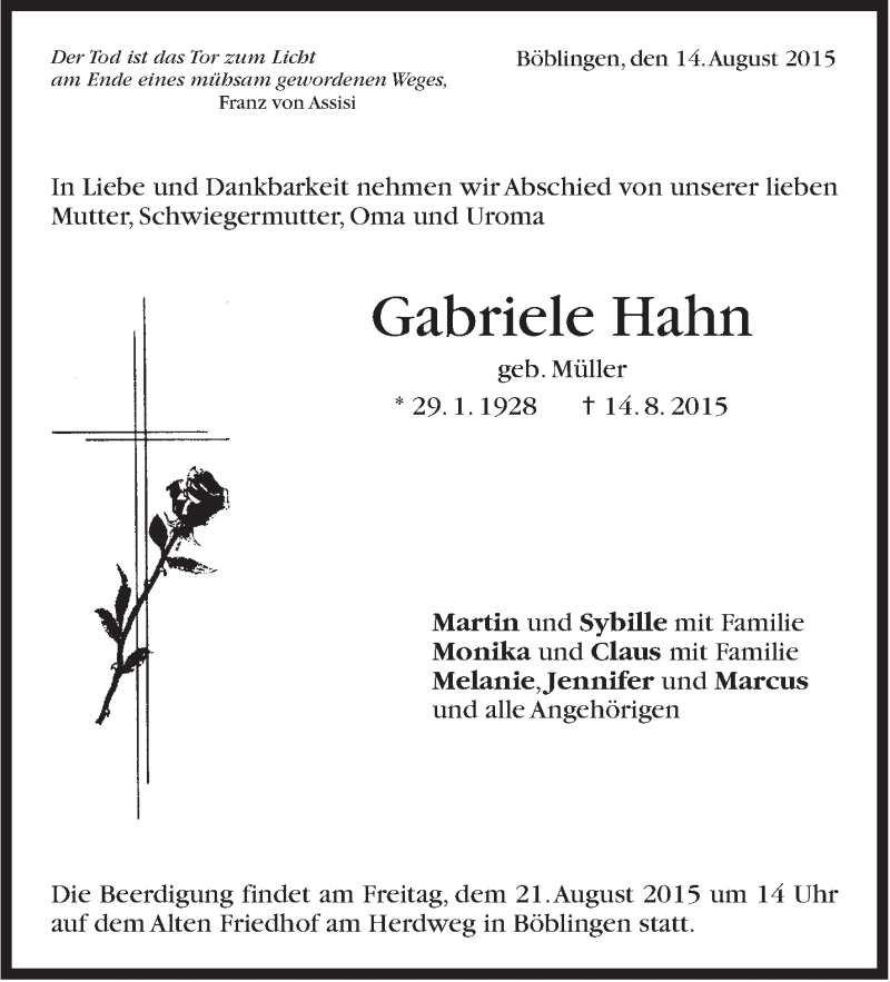Hier finden Sie alle Traueranzeigen aus der Zeitung, die bisher für Gabriele Hahn erschienen sind. Weitere Traueranzeigen, die in der Zeitung erscheinen, werden hier ebenfalls aufgelistet