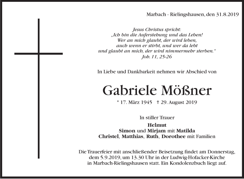 Hier finden Sie alle Traueranzeigen aus der Zeitung, die bisher für Gabriele Mößner erschienen sind. Weitere Traueranzeigen, die in der Zeitung erscheinen, werden hier ebenfalls aufgelistet