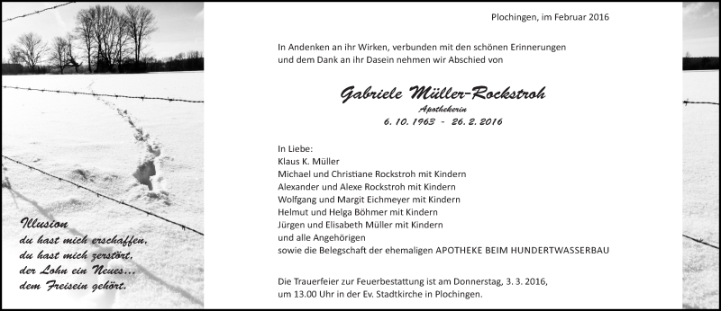 Hier finden Sie alle Traueranzeigen aus der Zeitung, die bisher für Gabriele Müller-Rockstroh erschienen sind. Weitere Traueranzeigen, die in der Zeitung erscheinen, werden hier ebenfalls aufgelistet