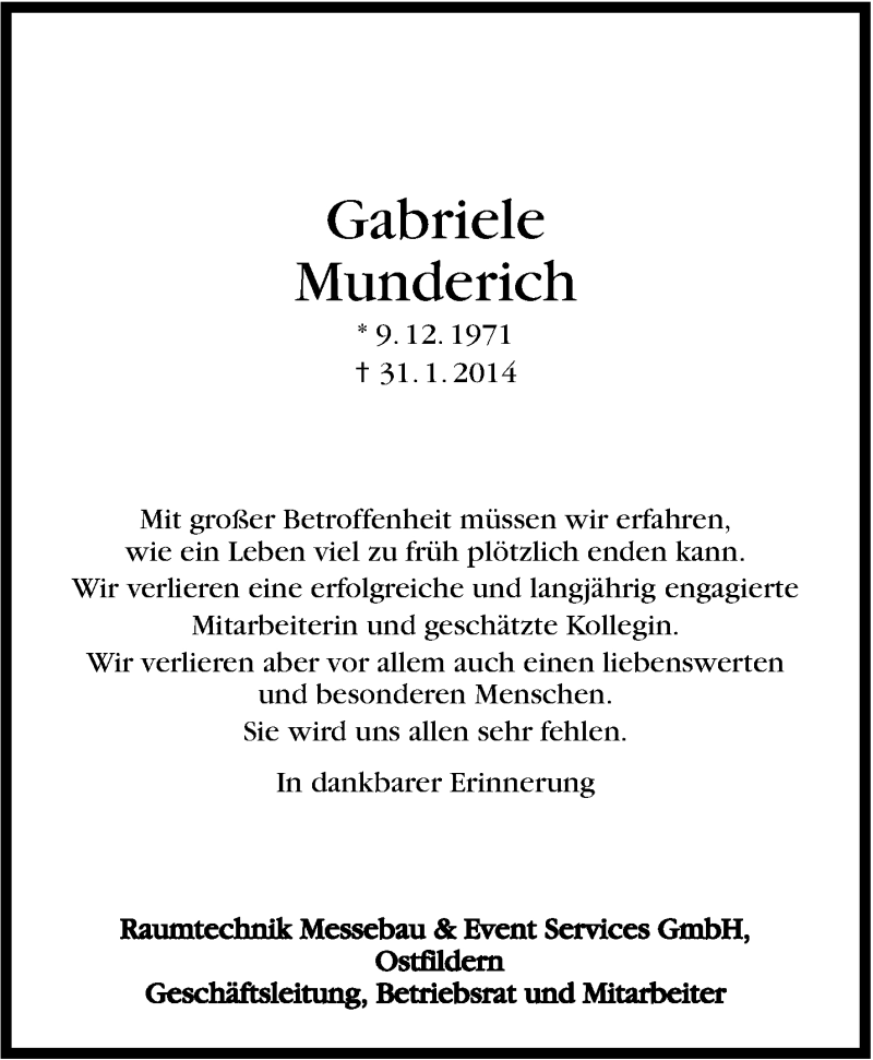 Hier finden Sie alle Traueranzeigen aus der Zeitung, die bisher für Gabriele Munderich erschienen sind. Weitere Traueranzeigen, die in der Zeitung erscheinen, werden hier ebenfalls aufgelistet
