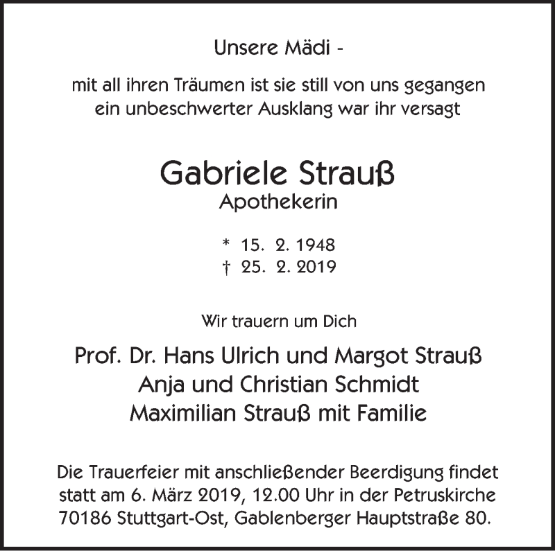 Hier finden Sie alle Traueranzeigen aus der Zeitung, die bisher für Gabriele Strauß erschienen sind. Weitere Traueranzeigen, die in der Zeitung erscheinen, werden hier ebenfalls aufgelistet