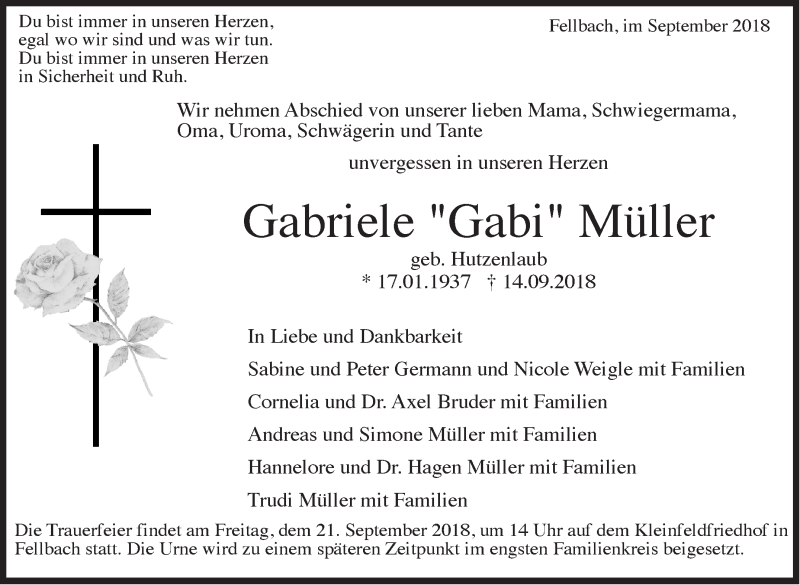Hier finden Sie alle Traueranzeigen aus der Zeitung, die bisher für Gabriele Gabi Müller erschienen sind. Weitere Traueranzeigen, die in der Zeitung erscheinen, werden hier ebenfalls aufgelistet