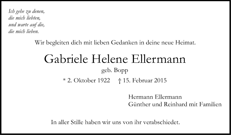 Hier finden Sie alle Traueranzeigen aus der Zeitung, die bisher für Gabriele Helene Ellermann erschienen sind. Weitere Traueranzeigen, die in der Zeitung erscheinen, werden hier ebenfalls aufgelistet