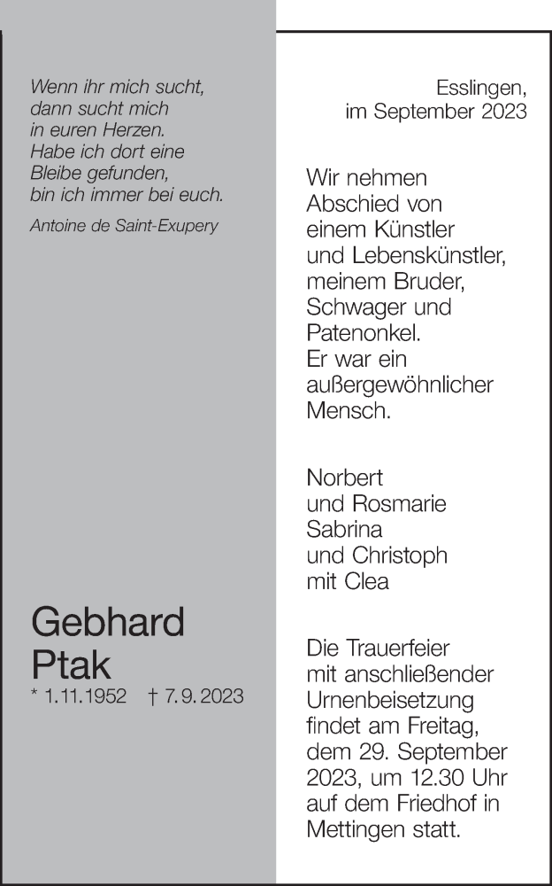 Hier finden Sie alle Traueranzeigen aus der Zeitung, die bisher für Gebhard Ptak erschienen sind. Weitere Traueranzeigen, die in der Zeitung erscheinen, werden hier ebenfalls aufgelistet