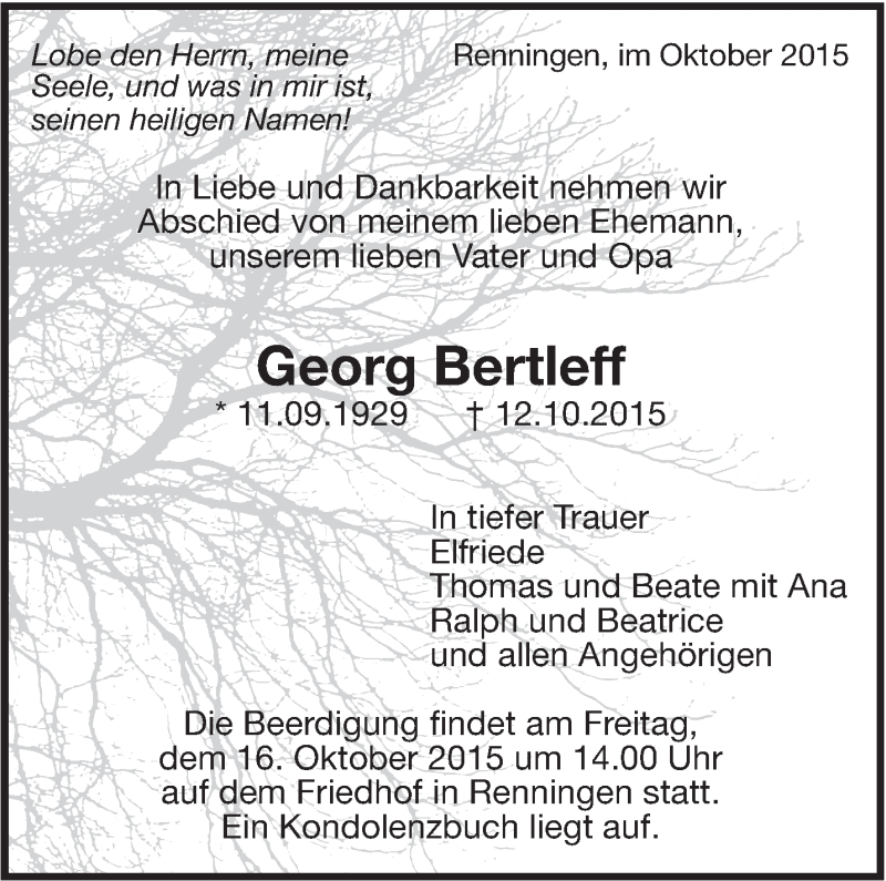 Hier finden Sie alle Traueranzeigen aus der Zeitung, die bisher für Georg Bertleff erschienen sind. Weitere Traueranzeigen, die in der Zeitung erscheinen, werden hier ebenfalls aufgelistet