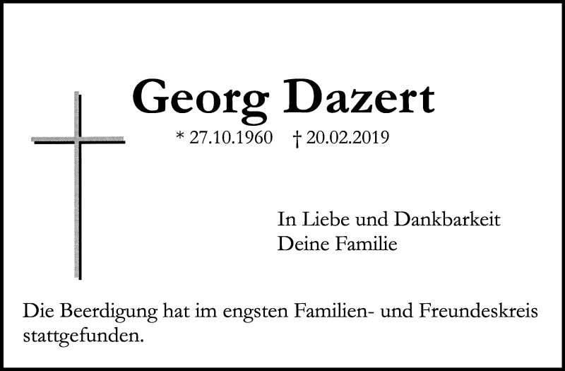 Hier finden Sie alle Traueranzeigen aus der Zeitung, die bisher für Georg Dazert erschienen sind. Weitere Traueranzeigen, die in der Zeitung erscheinen, werden hier ebenfalls aufgelistet