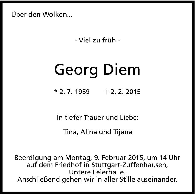 Hier finden Sie alle Traueranzeigen aus der Zeitung, die bisher für Georg Diem erschienen sind. Weitere Traueranzeigen, die in der Zeitung erscheinen, werden hier ebenfalls aufgelistet