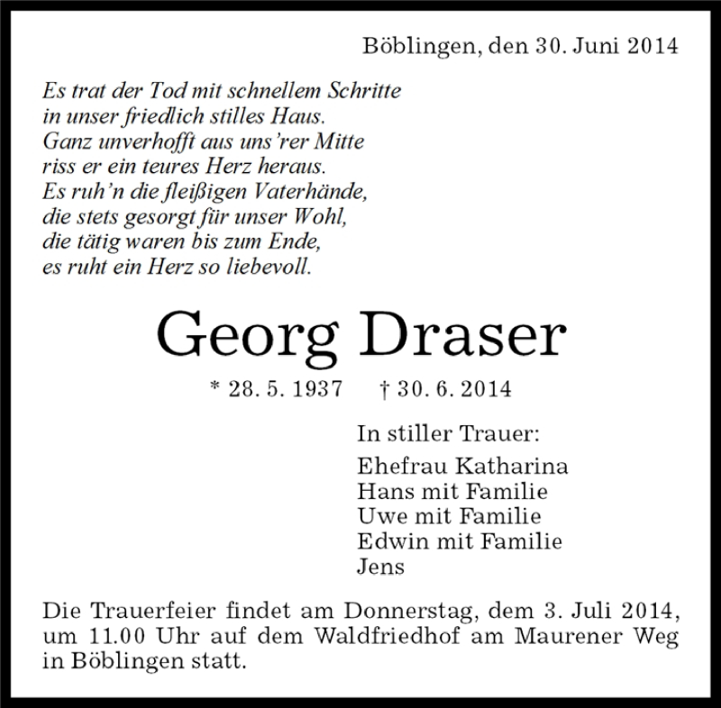 Hier finden Sie alle Traueranzeigen aus der Zeitung, die bisher für Georg Draser erschienen sind. Weitere Traueranzeigen, die in der Zeitung erscheinen, werden hier ebenfalls aufgelistet