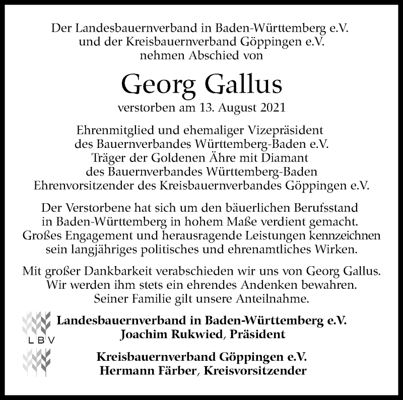 Hier finden Sie alle Traueranzeigen aus der Zeitung, die bisher für Georg Gallus erschienen sind. Weitere Traueranzeigen, die in der Zeitung erscheinen, werden hier ebenfalls aufgelistet