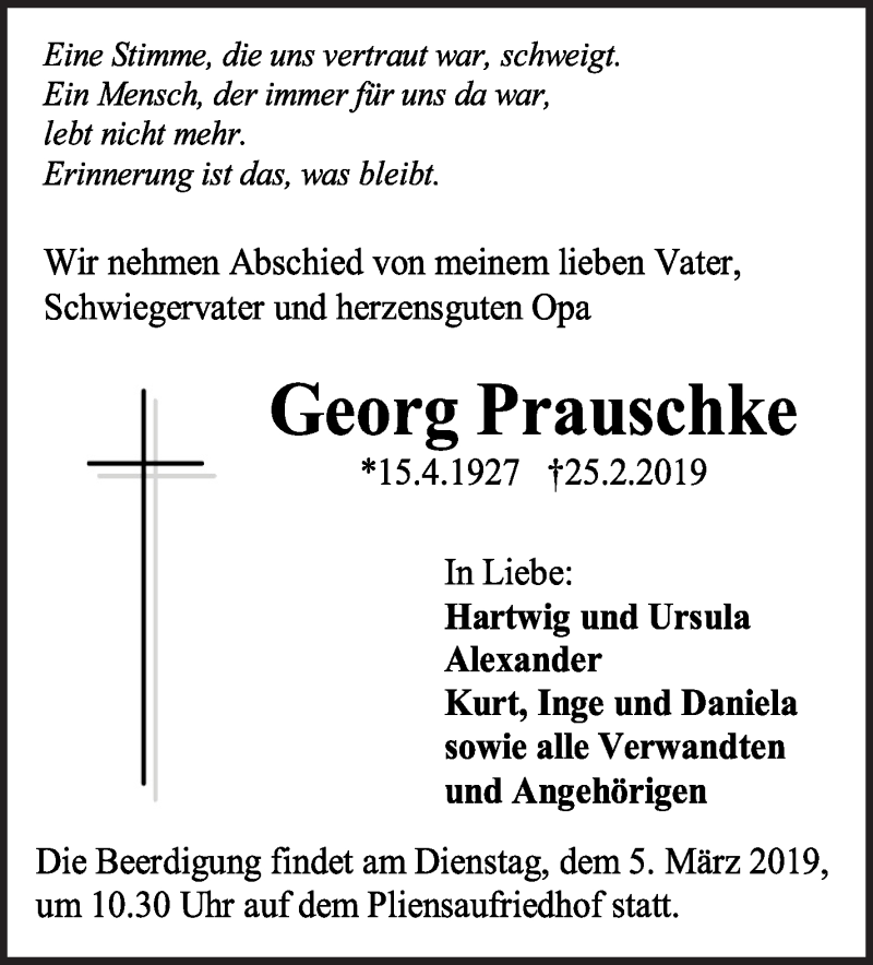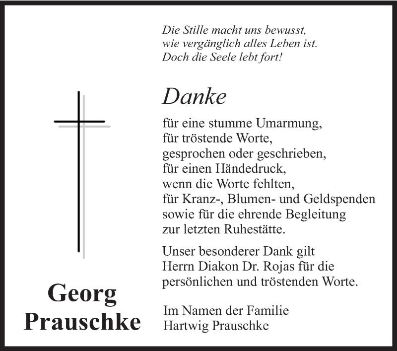 Hier finden Sie alle Traueranzeigen aus der Zeitung, die bisher für Georg Prauschke erschienen sind. Weitere Traueranzeigen, die in der Zeitung erscheinen, werden hier ebenfalls aufgelistet