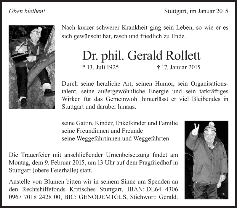 Hier finden Sie alle Traueranzeigen aus der Zeitung, die bisher für Gerald Rollett erschienen sind. Weitere Traueranzeigen, die in der Zeitung erscheinen, werden hier ebenfalls aufgelistet