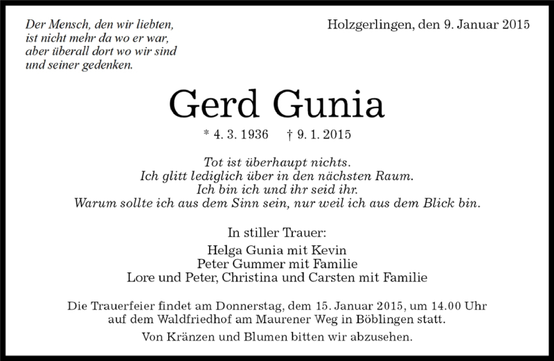 Hier finden Sie alle Traueranzeigen aus der Zeitung, die bisher für Gerd Gunia erschienen sind. Weitere Traueranzeigen, die in der Zeitung erscheinen, werden hier ebenfalls aufgelistet