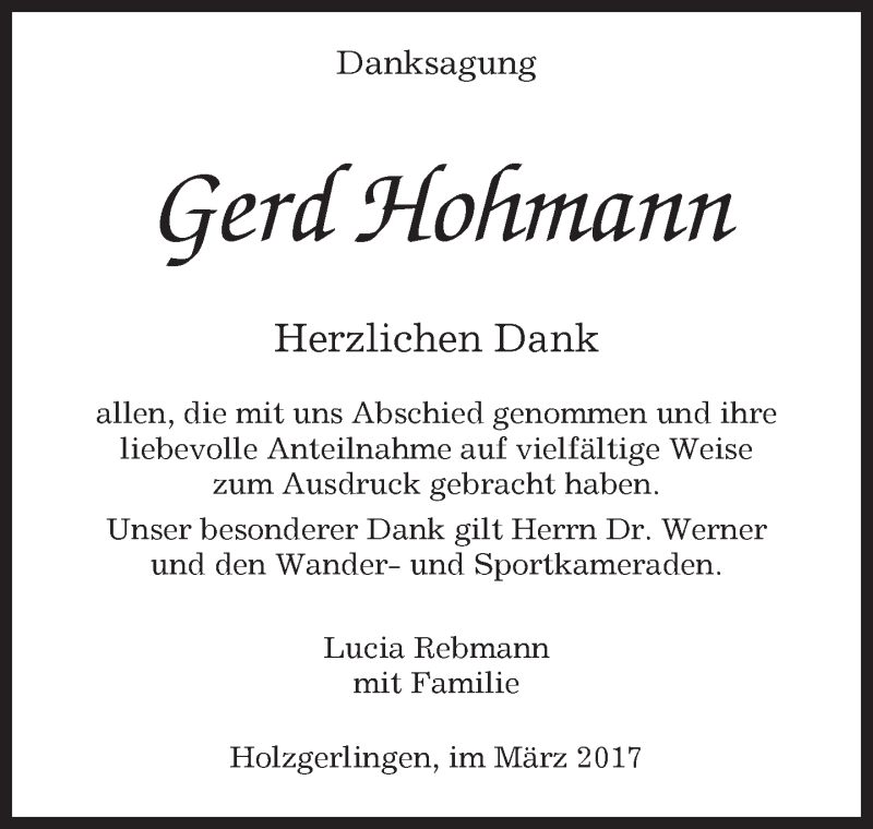 Hier finden Sie alle Traueranzeigen aus der Zeitung, die bisher für Gerd Hohmann erschienen sind. Weitere Traueranzeigen, die in der Zeitung erscheinen, werden hier ebenfalls aufgelistet