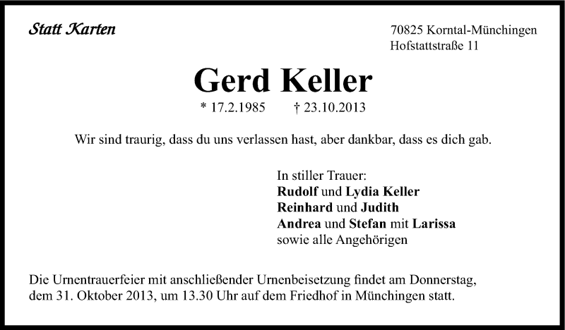 Hier finden Sie alle Traueranzeigen aus der Zeitung, die bisher für Gerd Keller erschienen sind. Weitere Traueranzeigen, die in der Zeitung erscheinen, werden hier ebenfalls aufgelistet