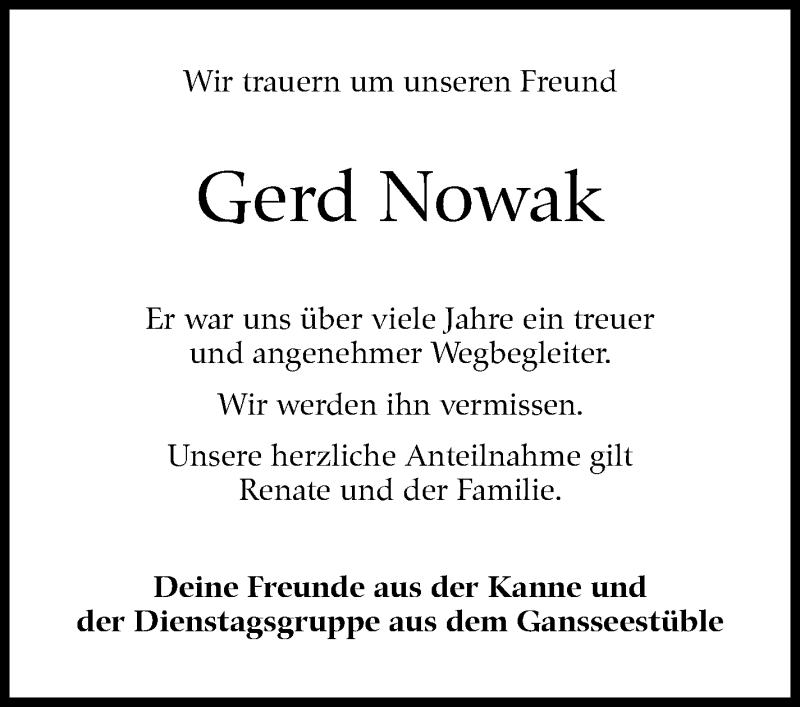 Hier finden Sie alle Traueranzeigen aus der Zeitung, die bisher für Gerd Nowak erschienen sind. Weitere Traueranzeigen, die in der Zeitung erscheinen, werden hier ebenfalls aufgelistet
