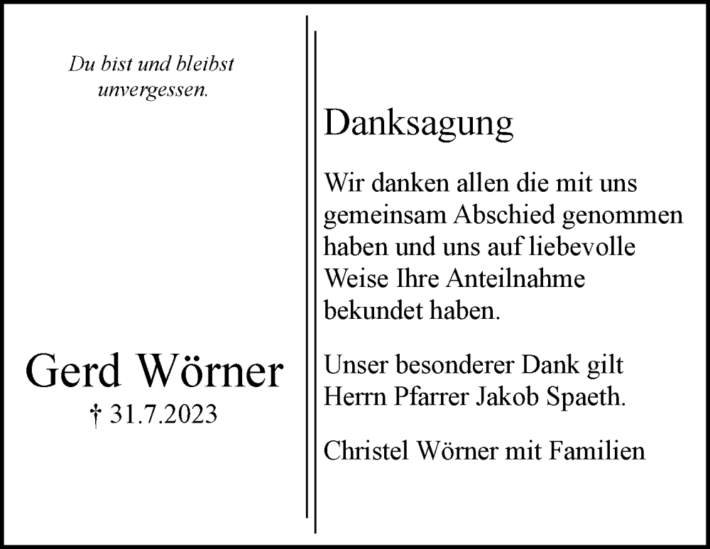 Hier finden Sie alle Traueranzeigen aus der Zeitung, die bisher für Gerd Wörner erschienen sind. Weitere Traueranzeigen, die in der Zeitung erscheinen, werden hier ebenfalls aufgelistet