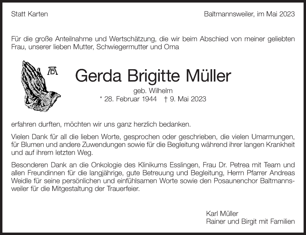 Hier finden Sie alle Traueranzeigen aus der Zeitung, die bisher für Gerda Brigitte Müller erschienen sind. Weitere Traueranzeigen, die in der Zeitung erscheinen, werden hier ebenfalls aufgelistet