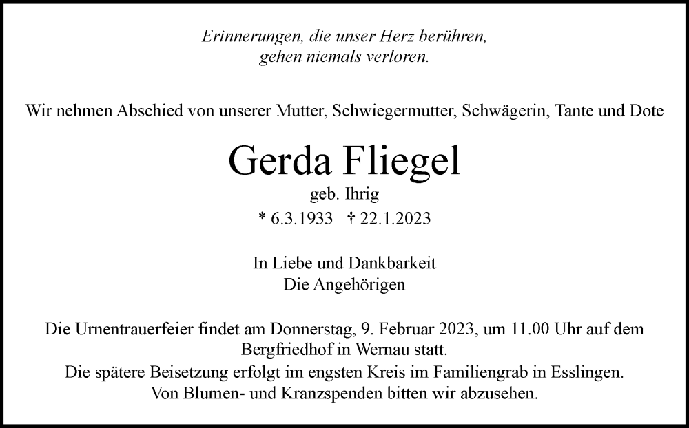 Hier finden Sie alle Traueranzeigen aus der Zeitung, die bisher für Gerda Fliegel erschienen sind. Weitere Traueranzeigen, die in der Zeitung erscheinen, werden hier ebenfalls aufgelistet