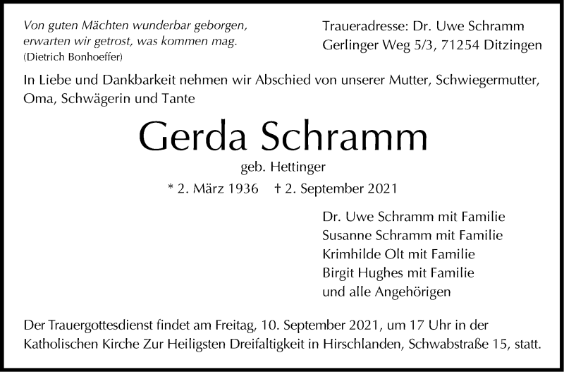 Hier finden Sie alle Traueranzeigen aus der Zeitung, die bisher für Gerda Schramm erschienen sind. Weitere Traueranzeigen, die in der Zeitung erscheinen, werden hier ebenfalls aufgelistet