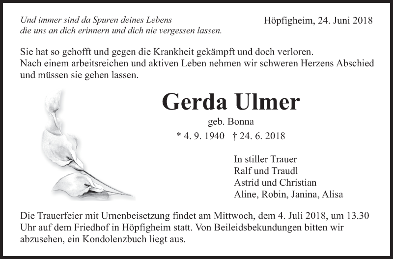 Hier finden Sie alle Traueranzeigen aus der Zeitung, die bisher für Gerda Ulmer erschienen sind. Weitere Traueranzeigen, die in der Zeitung erscheinen, werden hier ebenfalls aufgelistet