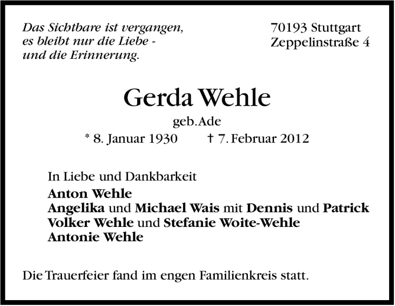 Hier finden Sie alle Traueranzeigen aus der Zeitung, die bisher für Gerda Wehle erschienen sind. Weitere Traueranzeigen, die in der Zeitung erscheinen, werden hier ebenfalls aufgelistet