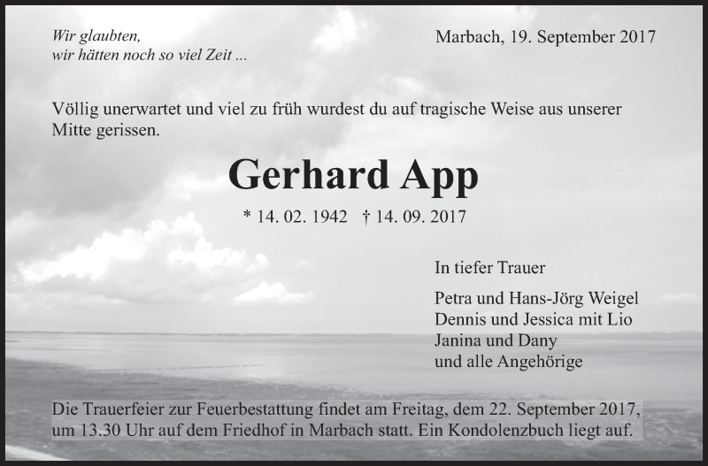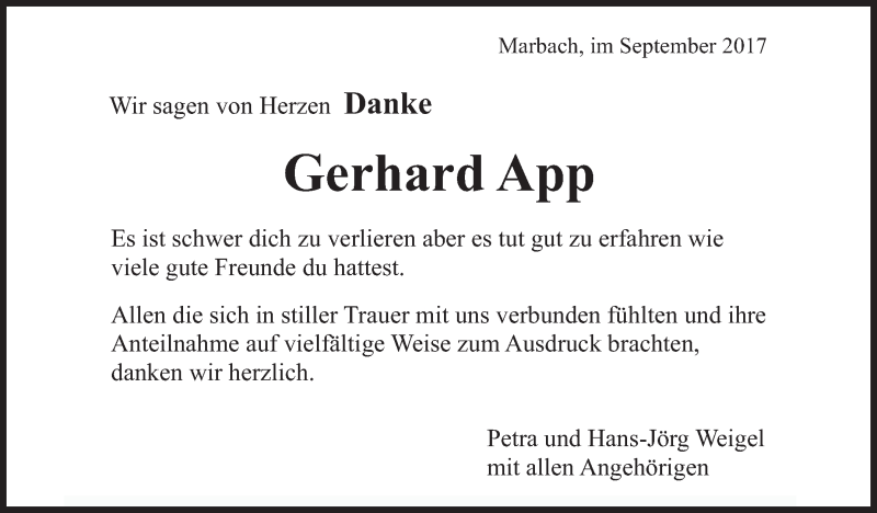 Hier finden Sie alle Traueranzeigen aus der Zeitung, die bisher für Gerhard App erschienen sind. Weitere Traueranzeigen, die in der Zeitung erscheinen, werden hier ebenfalls aufgelistet
