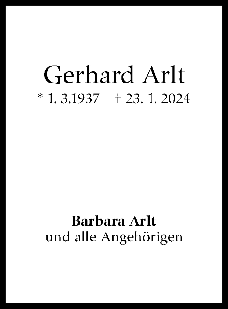 Hier finden Sie alle Traueranzeigen aus der Zeitung, die bisher für Gerhard Arlt erschienen sind. Weitere Traueranzeigen, die in der Zeitung erscheinen, werden hier ebenfalls aufgelistet
