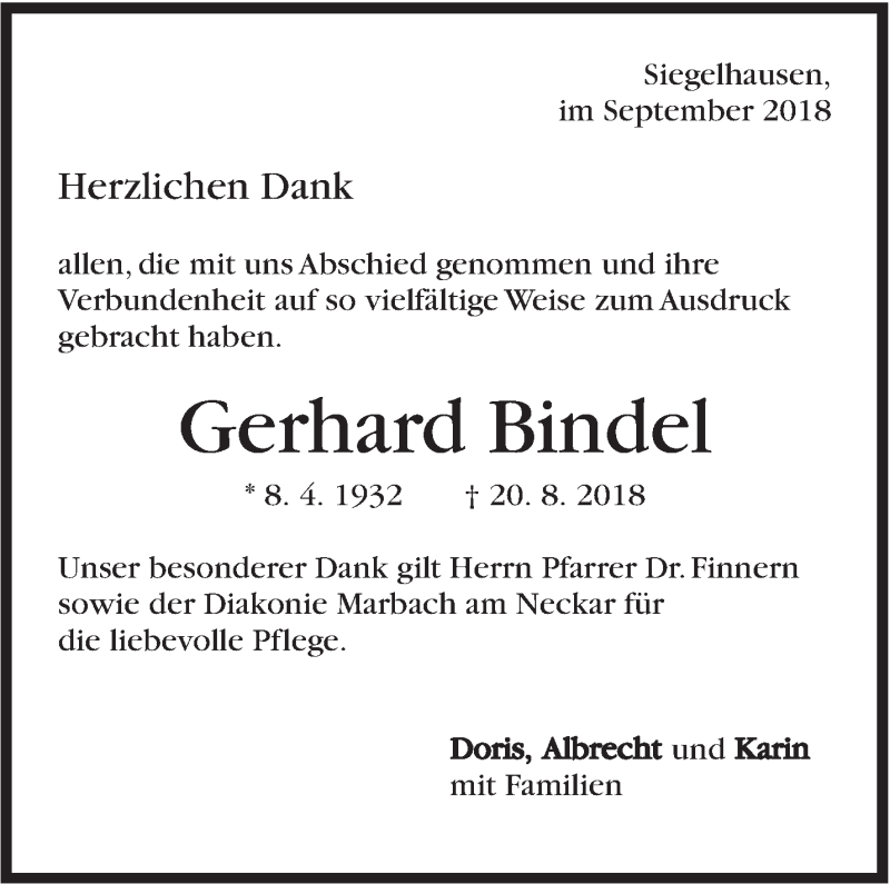 Hier finden Sie alle Traueranzeigen aus der Zeitung, die bisher für Gerhard Bindel erschienen sind. Weitere Traueranzeigen, die in der Zeitung erscheinen, werden hier ebenfalls aufgelistet