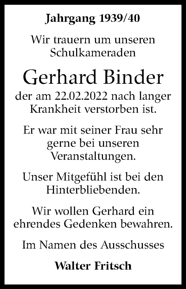 Hier finden Sie alle Traueranzeigen aus der Zeitung, die bisher für Gerhard Binder erschienen sind. Weitere Traueranzeigen, die in der Zeitung erscheinen, werden hier ebenfalls aufgelistet