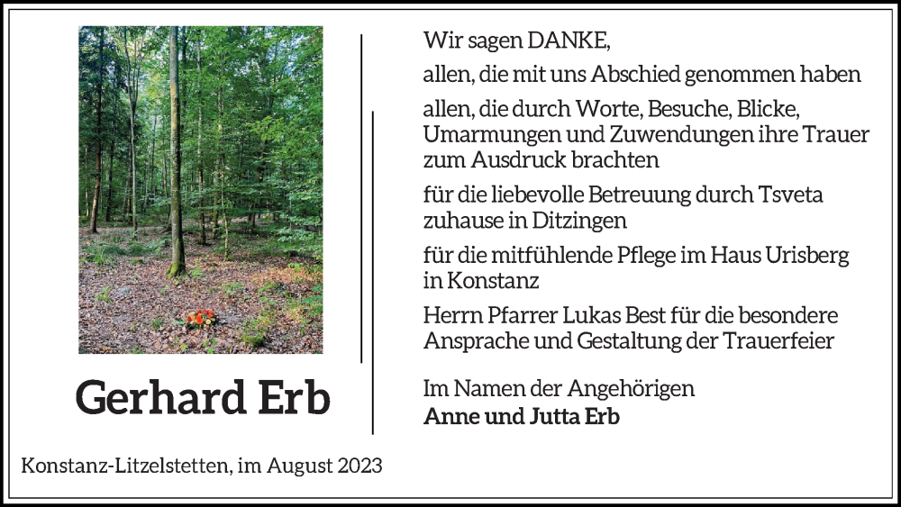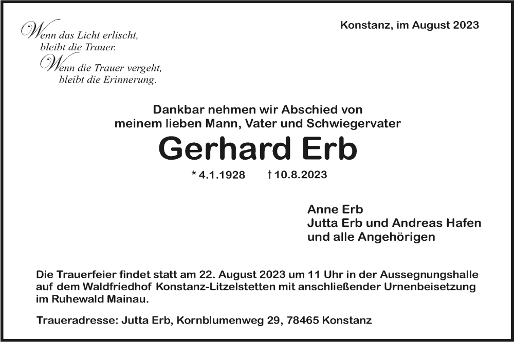 Hier finden Sie alle Traueranzeigen aus der Zeitung, die bisher für Gerhard Erb erschienen sind. Weitere Traueranzeigen, die in der Zeitung erscheinen, werden hier ebenfalls aufgelistet