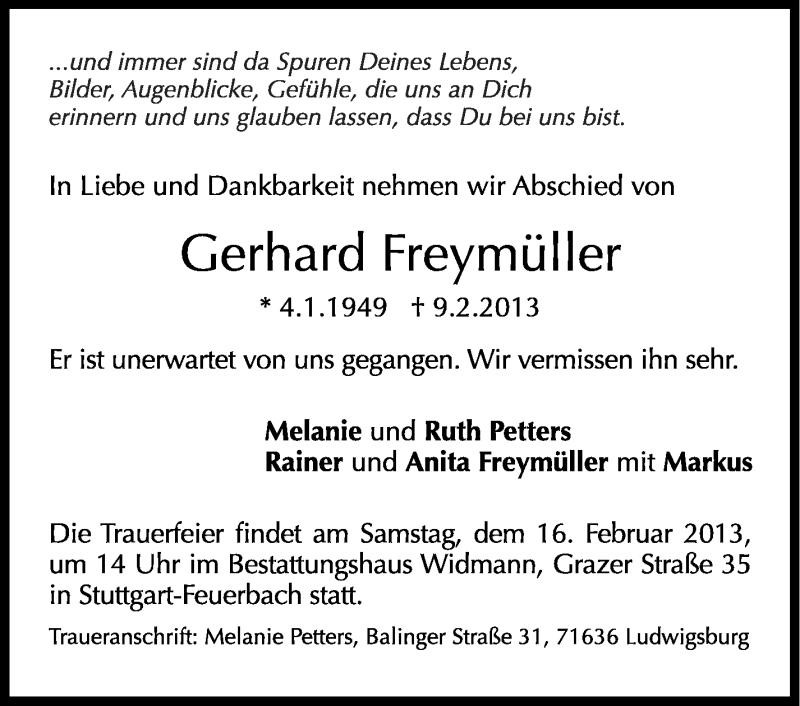 Hier finden Sie alle Traueranzeigen aus der Zeitung, die bisher für Gerhard Freymüller erschienen sind. Weitere Traueranzeigen, die in der Zeitung erscheinen, werden hier ebenfalls aufgelistet
