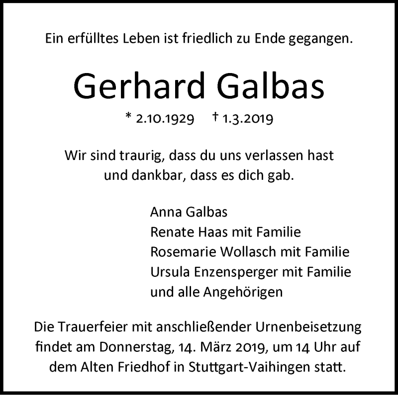 Hier finden Sie alle Traueranzeigen aus der Zeitung, die bisher für Gerhard Galbas erschienen sind. Weitere Traueranzeigen, die in der Zeitung erscheinen, werden hier ebenfalls aufgelistet