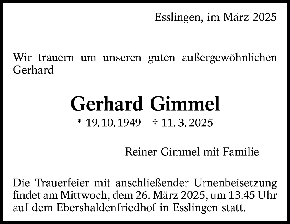 Hier finden Sie alle Traueranzeigen aus der Zeitung, die bisher für Gerhard Gimmel erschienen sind. Weitere Traueranzeigen, die in der Zeitung erscheinen, werden hier ebenfalls aufgelistet