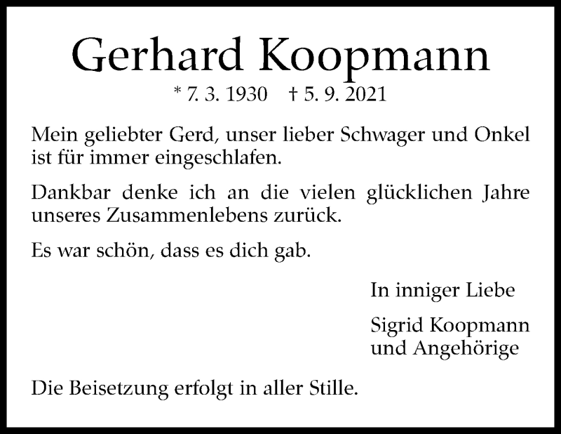 Hier finden Sie alle Traueranzeigen aus der Zeitung, die bisher für Gerhard Koopmann erschienen sind. Weitere Traueranzeigen, die in der Zeitung erscheinen, werden hier ebenfalls aufgelistet