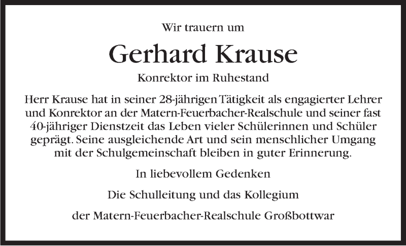 Hier finden Sie alle Traueranzeigen aus der Zeitung, die bisher für Gerhard Krause erschienen sind. Weitere Traueranzeigen, die in der Zeitung erscheinen, werden hier ebenfalls aufgelistet