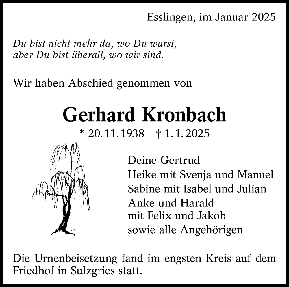 Hier finden Sie alle Traueranzeigen aus der Zeitung, die bisher für Gerhard Kronbach erschienen sind. Weitere Traueranzeigen, die in der Zeitung erscheinen, werden hier ebenfalls aufgelistet