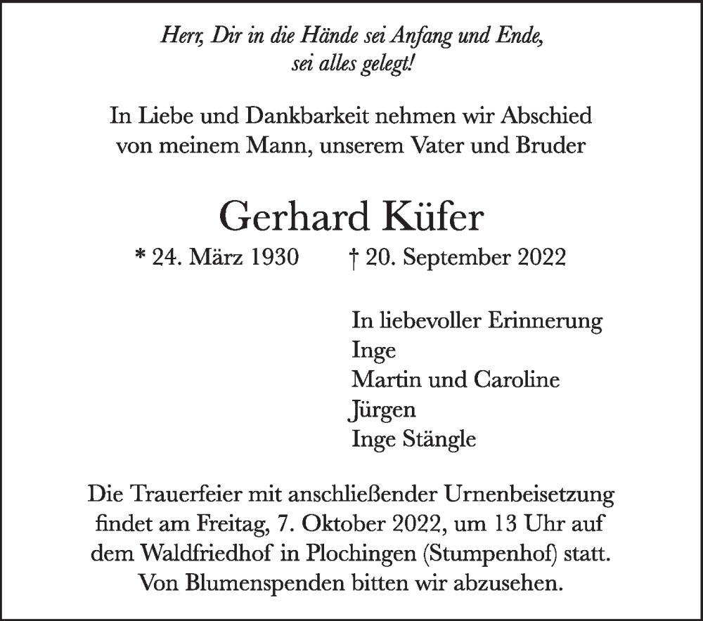 Hier finden Sie alle Traueranzeigen aus der Zeitung, die bisher für Gerhard Küfer erschienen sind. Weitere Traueranzeigen, die in der Zeitung erscheinen, werden hier ebenfalls aufgelistet