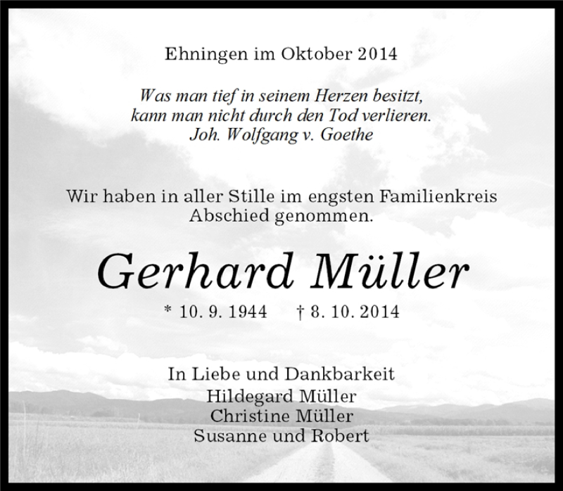 Hier finden Sie alle Traueranzeigen aus der Zeitung, die bisher für Gerhard Müller erschienen sind. Weitere Traueranzeigen, die in der Zeitung erscheinen, werden hier ebenfalls aufgelistet