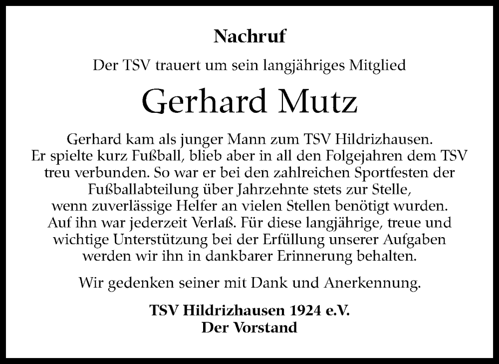 Hier finden Sie alle Traueranzeigen aus der Zeitung, die bisher für Gerhard Mutz erschienen sind. Weitere Traueranzeigen, die in der Zeitung erscheinen, werden hier ebenfalls aufgelistet
