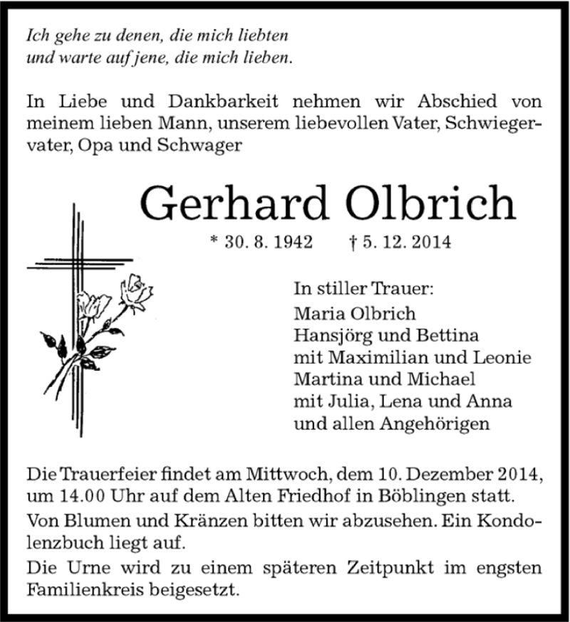 Hier finden Sie alle Traueranzeigen aus der Zeitung, die bisher für Gerhard Olbrich erschienen sind. Weitere Traueranzeigen, die in der Zeitung erscheinen, werden hier ebenfalls aufgelistet