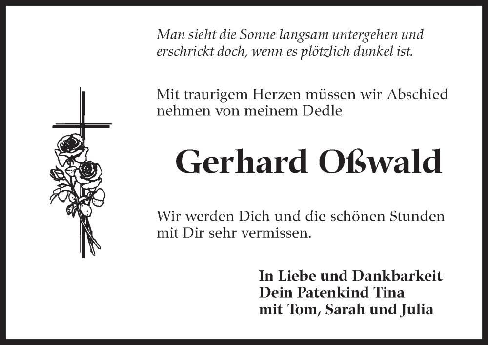 Hier finden Sie alle Traueranzeigen aus der Zeitung, die bisher für Gerhard Oßwald erschienen sind. Weitere Traueranzeigen, die in der Zeitung erscheinen, werden hier ebenfalls aufgelistet