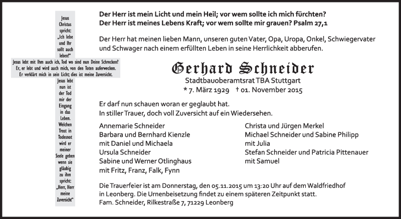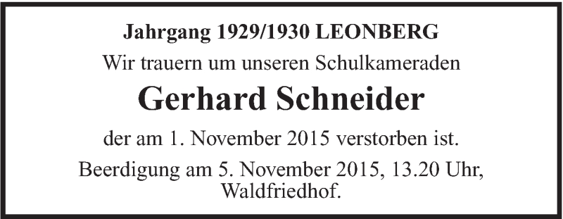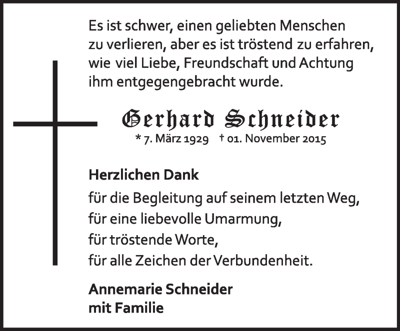 Hier finden Sie alle Traueranzeigen aus der Zeitung, die bisher für Gerhard Schneider erschienen sind. Weitere Traueranzeigen, die in der Zeitung erscheinen, werden hier ebenfalls aufgelistet